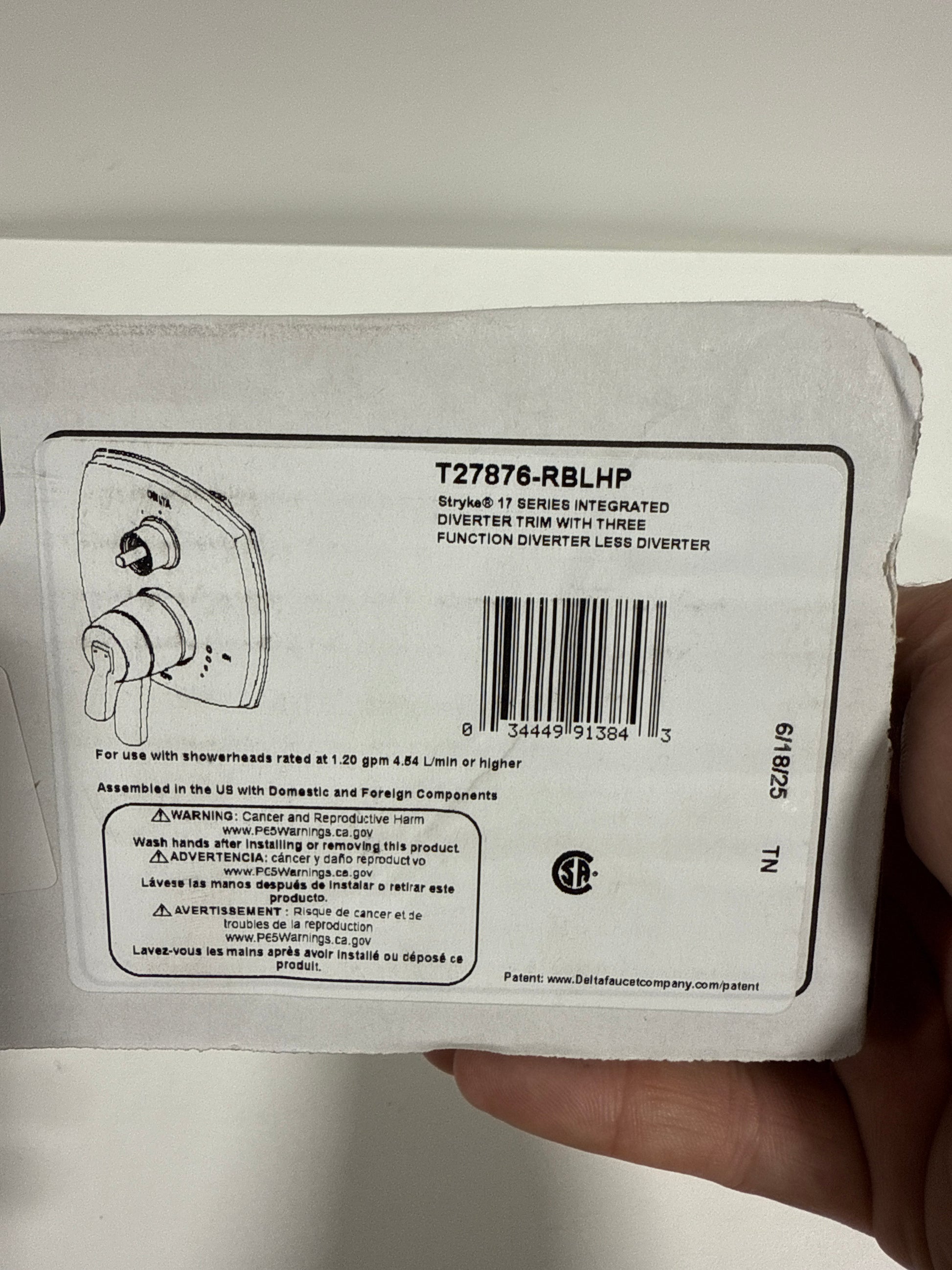 Delta T27876-LHP Features: Covered under Delta s limited lifetime warranty Premier finishing process – finishes will resist rusting and corrosion through everyday use Coordinates with products from the Stryke line seamlessly Pressure balanced valve trim - dual cartridges control the water temperature and volume independently Top handle controls diverter functions Bottom handle controls on / off and adjusts volume Dial controls temperature Integrated 3 function shower diverter for 2 shower applications 2 individual positions 1 shared positions Optional non shared cartridge available RP71717 - not included Rough-in valve not included - when adding to cart valve options will be presented Complies with ADA standards All necessary mounting hardware is included Trim ships with cartridges Not recommended for tub spout applications Note: the RIGHT side diverter port MUST be capped Delta T27876-LHP Specifications: Valve Trim Height: 7 (bottom to top) Valve Trim Width: 7 (left to right) Variations: T27876-LHP: this model T27976-LHP: six function version of this model T24876-LHP: three function with no volume control T24976-LHP: six function with no volume control T27T876-LHP: three function thermostatic version T27T976-LHP: six function thermostatic version 3 Function Diverter Trim - 2 Individual Positions 1 Shared Position.