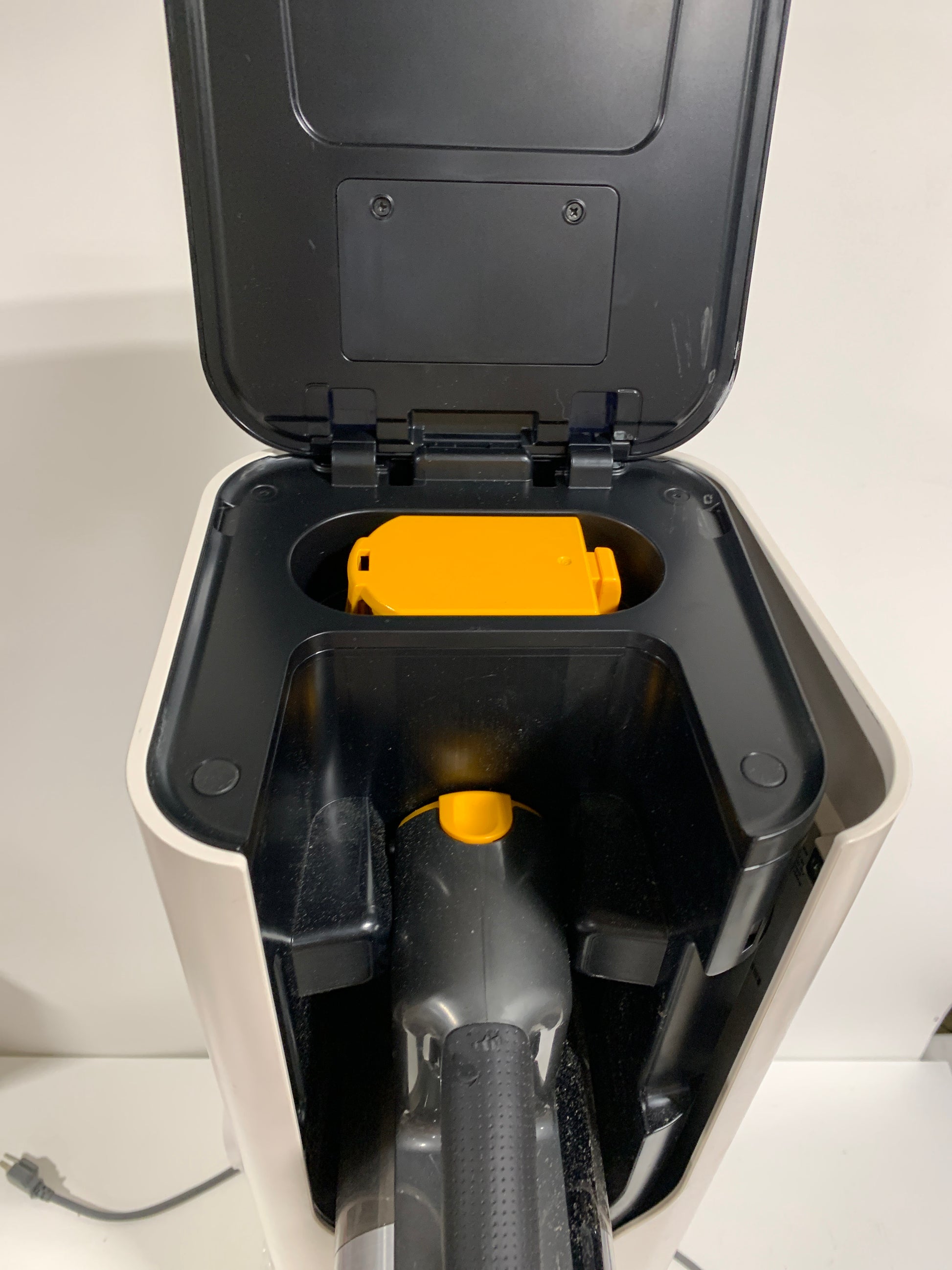 Used condition works well, Plastic clip to hold dust bin shut is broken, missing floor roller attachment as shown.
