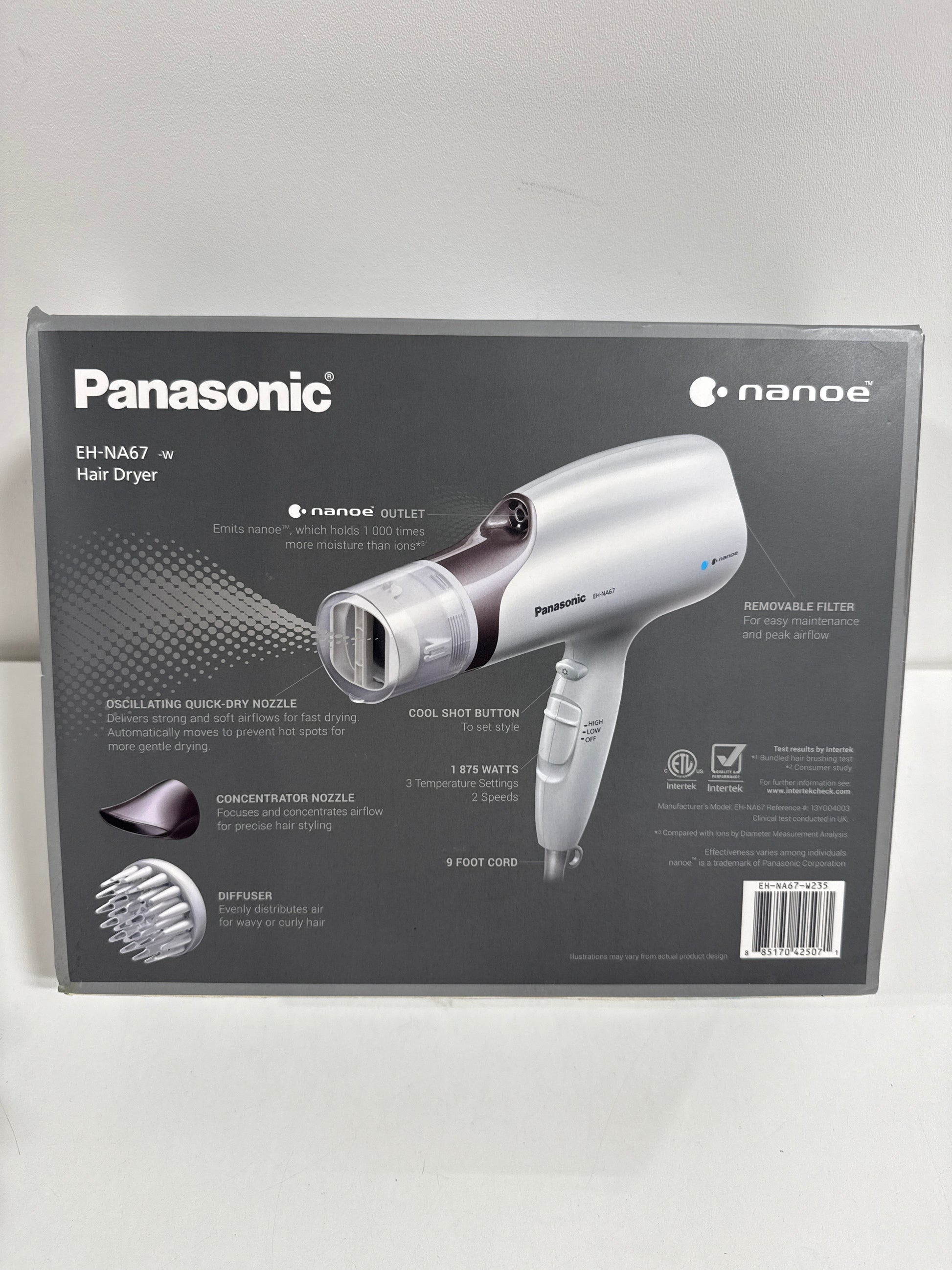 Introducing the Panasonic nanoe salon Hair dryer with oscillating quick-dry nozzle EH-NA67-W (white) The hair dryer that lets you achieve a healthy radiant look every day with no hot spots as you dry. A unique oscillating dryer head disperses heat evenly making sure you are in ultimate comfort. Moisture-infusing nanoe technology hydrates hair by gently infusing nanoe particles which hold 1000x more moisture than regular ions into every shaft of hair so you can dry hair without drying it out. The nanoe salon Hair dryer is perfect for the whole family whether you need an easy-breezy blow dry or more advanced salon-level styling from home. The included diffuser attachment helps you keep curls and waves healthy and hydrated and a concentrator attachment allows for a direct stream of air.