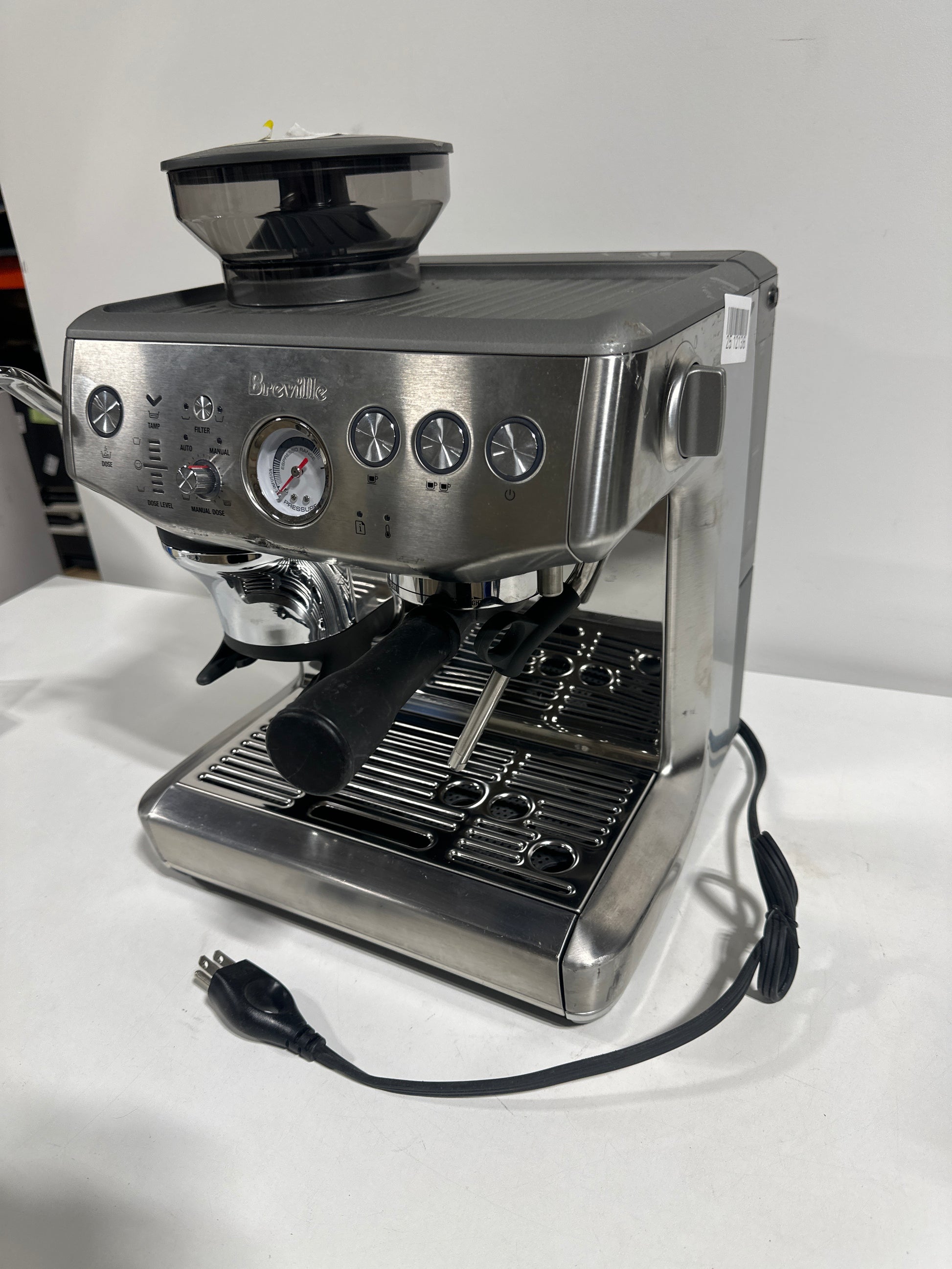 Brand: Breville Color: Stainless Steel Features: The Barista Express Impress espresso machine delivers third wave specialty coffee at home featuring the Impress puck system for manual espresso making made easy INTELLIGENT DOSING: The smart dosing system automatically calculates and adjusts the level of fresh coffee for the perfect dose every time PRECISION MEASURMENT: This smart system auto corrects the next dose taking the guesswork out of manual espresso making ASSISTED TAMPING: Replicating the action of a professional barista assisted tamping features 7 degree barista twist finish and consistent 10kg of pressure for a polished puck surface and clean tamp face 25 GRIND SETTINGS: Integrated conical burr grinder with 25 grind settings to fine tune your grind size for the desired extraction and flavor outcome THERMOCOIL HEATING SYSTEM: The Thermocoil system with PID control precisely controls temperature flow rate and contact time for great tasting coffee MICROFOAM STEAM WAND: Built in powerful manual steam wand allows you to hand texture microfoam milk enhancing the look and taste of your cup essential for latte art