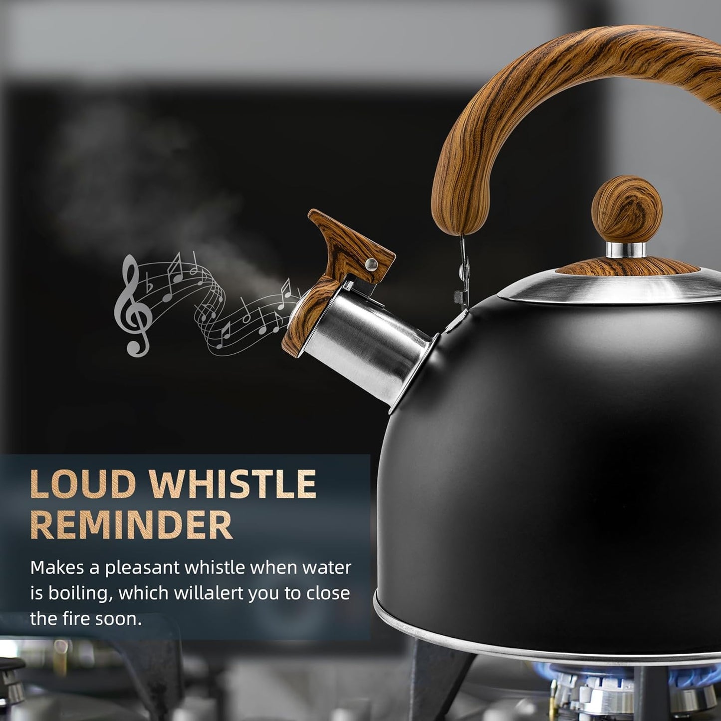 - ✅【EVERY DETAIL IS THOUGHTFUL】- Wide opening and mirror finish interior, easy to clean and fill. Collapsible handles allow for easy storage, and a comfortable touch provides a great lifting and pouring experience. Finished in a high temperature resistant spray paint finish, this superior whistling tea kettle has a matte black exterior with woodgrain handle to complement any kitchen layout and design.