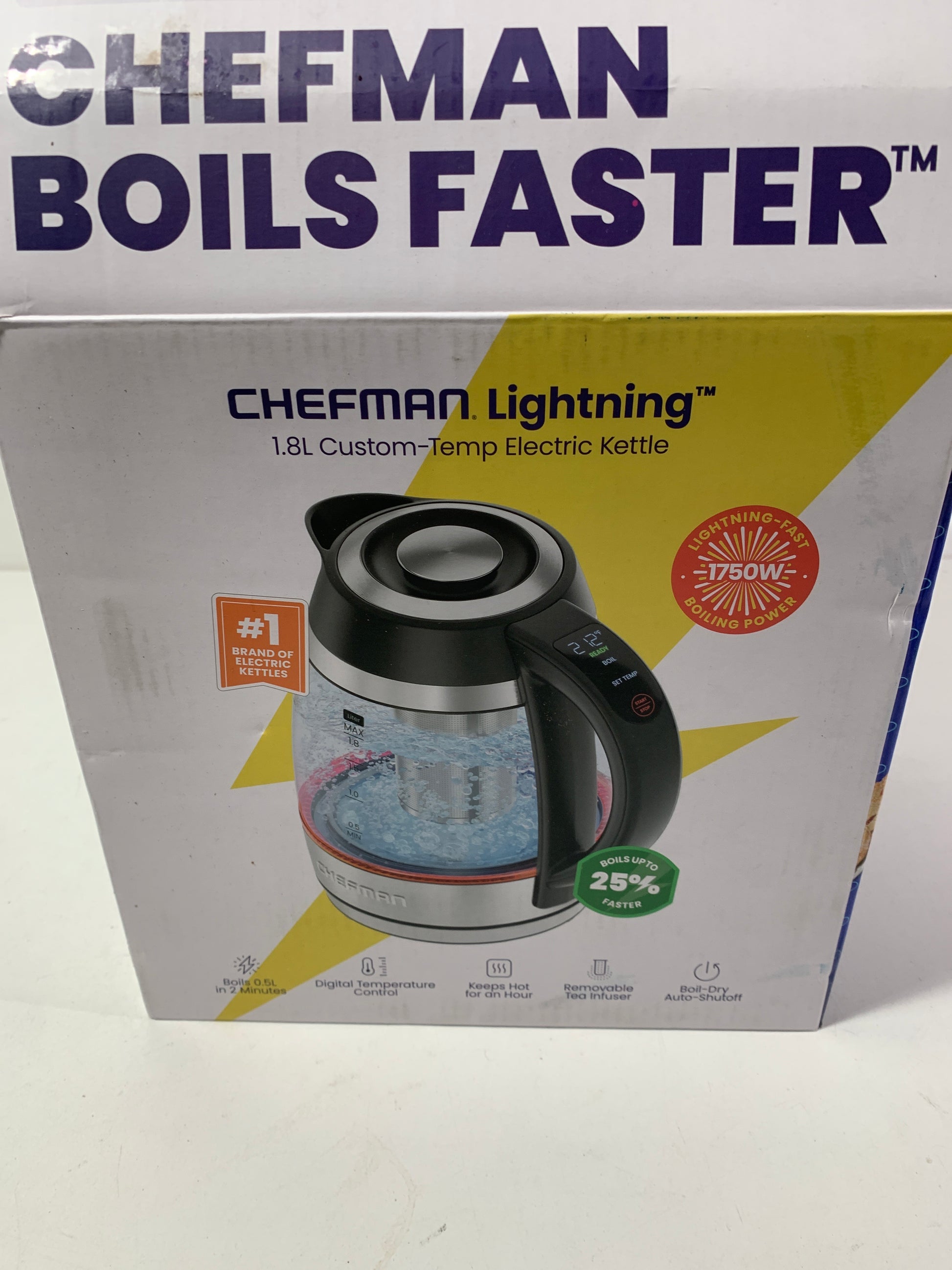 Chefman 1.8L Lightning Borosilicate Glass Electric Kettle: Stainless Steel Lid, 1750W