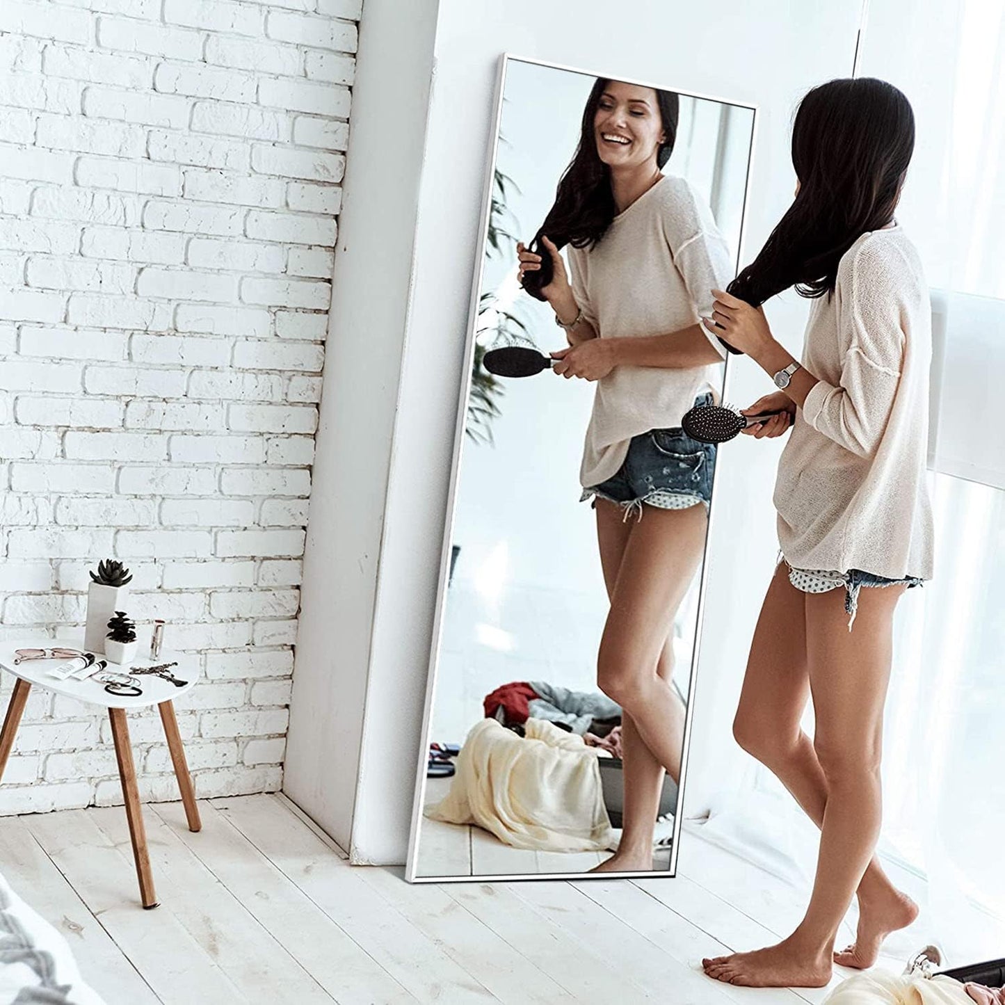 - ❀【EASY TO INSTALL】FLOOR MIRROR comes with a vertical stand. It can stand freely, lean against the wall or hang on the wall. There are hanging holes on the back of the mirror, just screw two free screws on the wall to hang the mirror. Suitable for bathroom, bedroom, living room, dressing room, hallway, clothing store, bring you beauty and confidence.